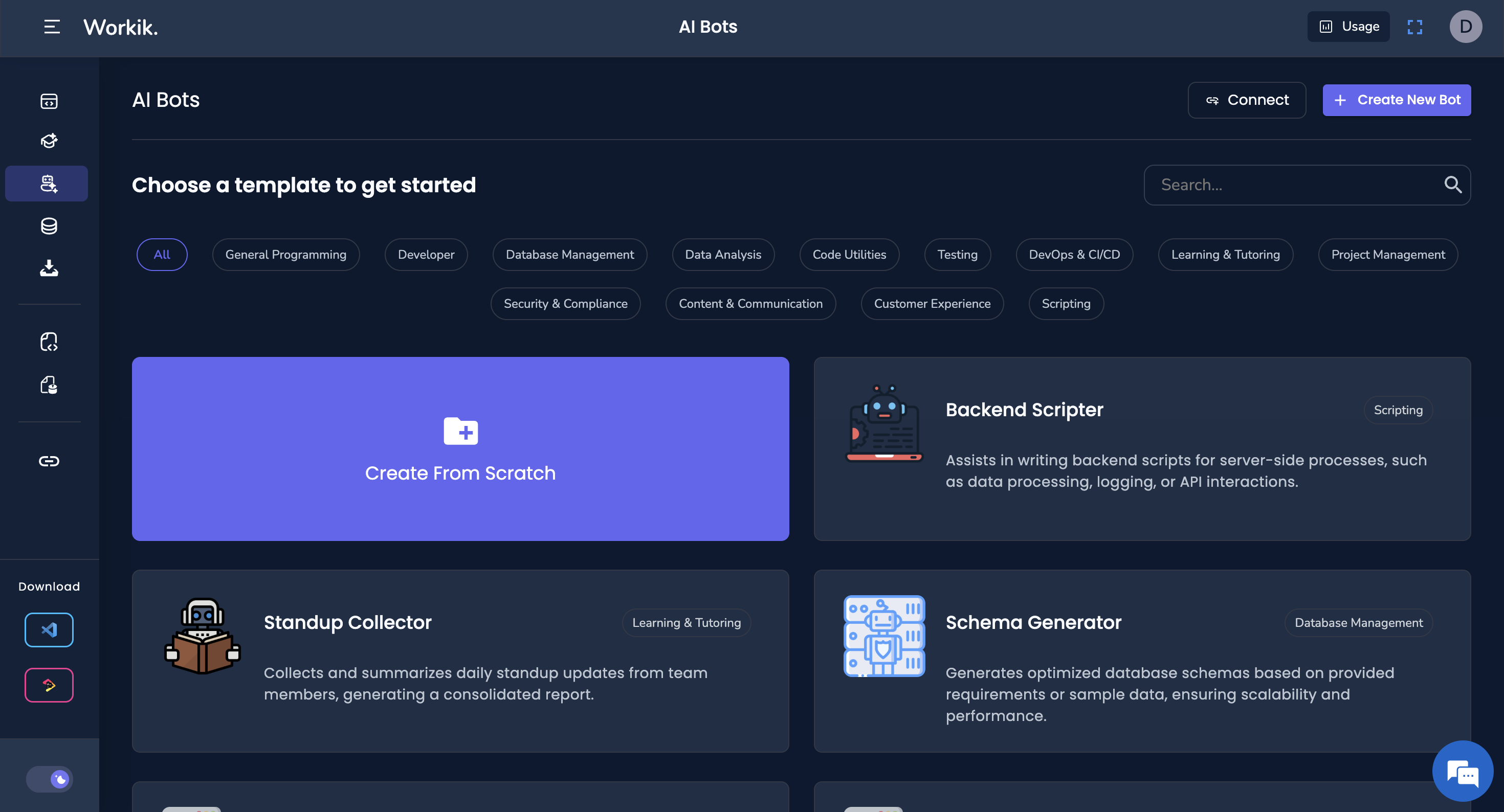 You can add everything your team works with — code files, API specifications (like Postman or Swagger), database schemas, internal docs, markdown files, and even structured text. Bots can pull from existing Workik workspaces.